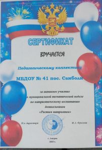 Педагогический состав МБДОУ №41 пос. Санболи, получил сертификат за активное участие в муниципальной тематической неделе по патриотическому воспитанию дошкольников «Растим патриотов»