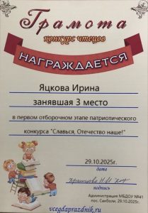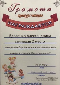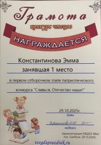 В МБДОУ №41 п. Санболи прошел первый отборочный этап патриотического конкурса художественного слова «Славься, Отечество наше!» Победитель первого этапа: Константинова Эмма.